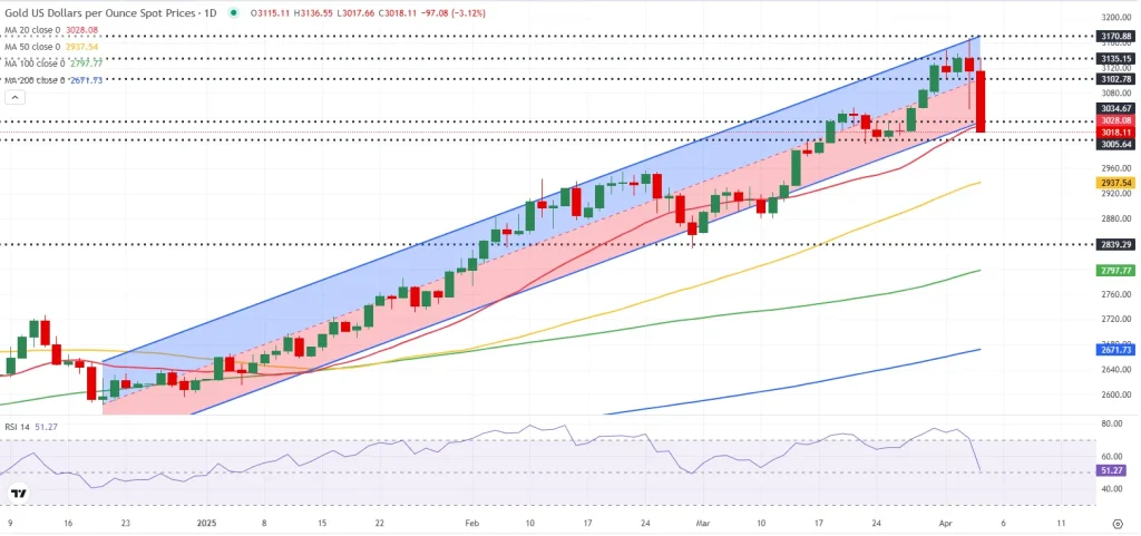 در چارت روزانه طلا، محدوده سه هزار و ۳۰ دلار به‌ عنوان پیوت کلیدی و محل تلاقی دو عامل تکنیکال مهم قرار گرفته است: کف کانال صعودی میان‌مدت و میانگین متحرک ۲۰ روزه.